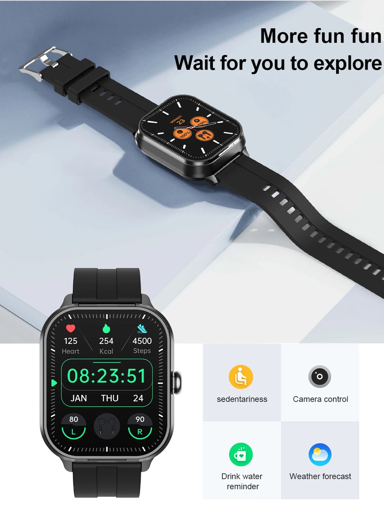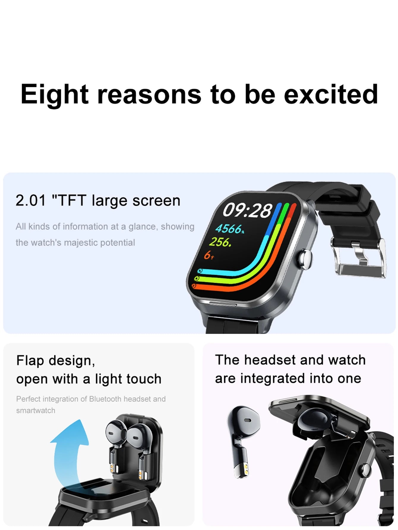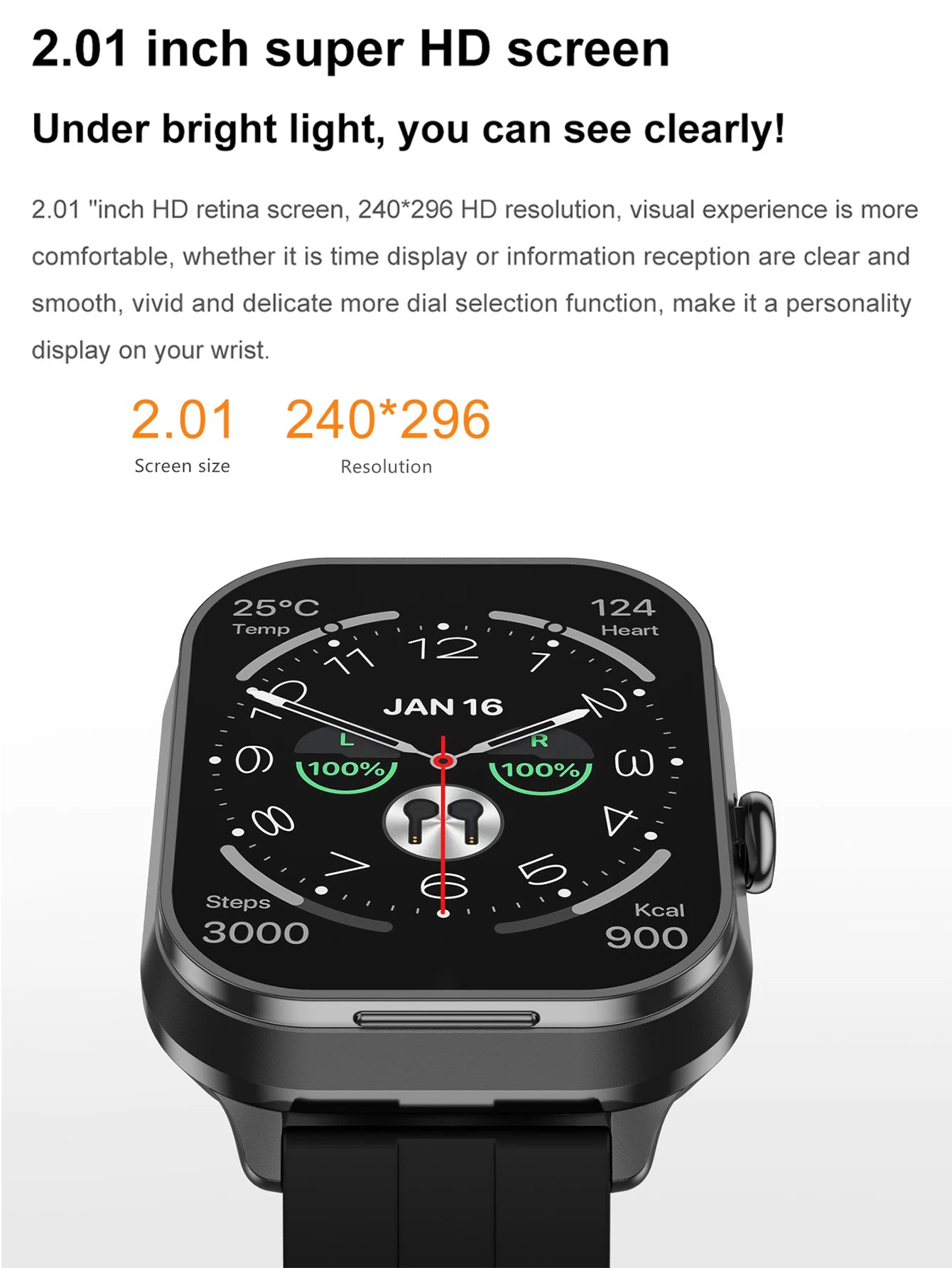 Stay connected, track your health, and enjoy seamless audio, all on your wrist! The Smart Watch 2.01" HD Large Screen combines cutting-edge technology with sleek design, offering 2-in-1 functionality with built-in Bluetooth earphones (TWS) for calls and music on the go.