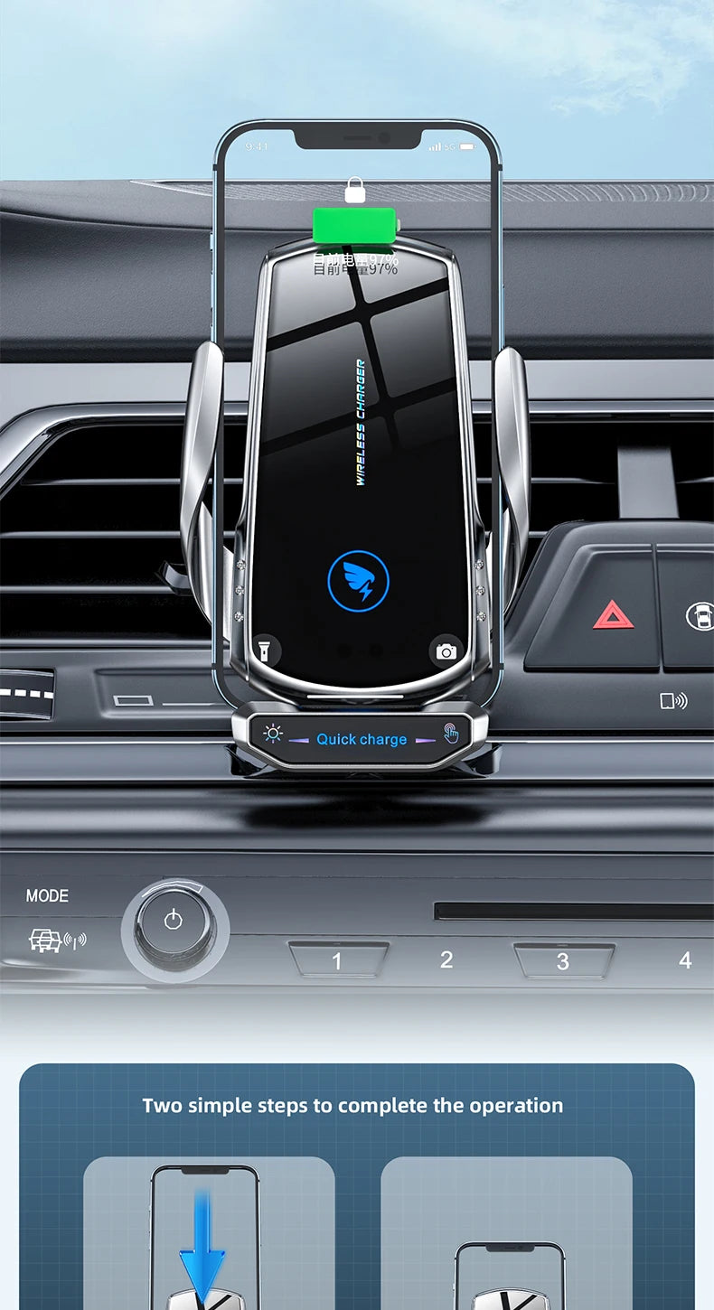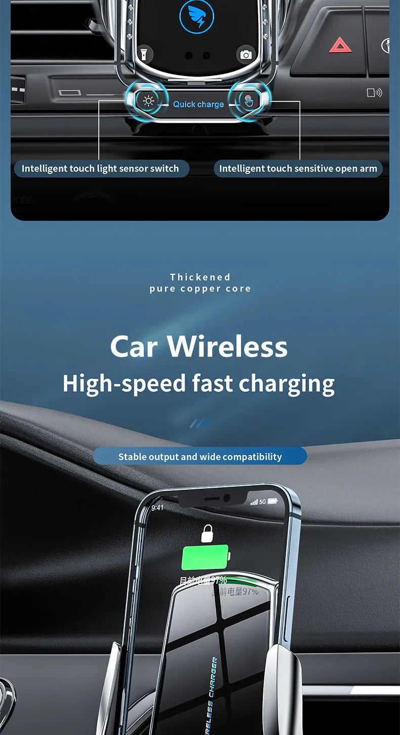 Stay charged and connected on the go with our 15W Fast Wireless Charging Car Phone Holder, a sleek, magnetic mount designed for iPhone, Xiaomi, Samsung, Huawei, and other Qi-compatible phones.