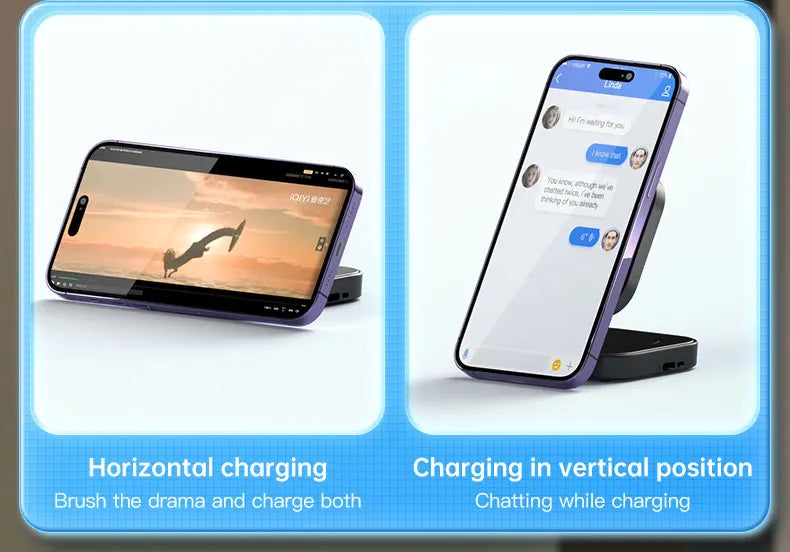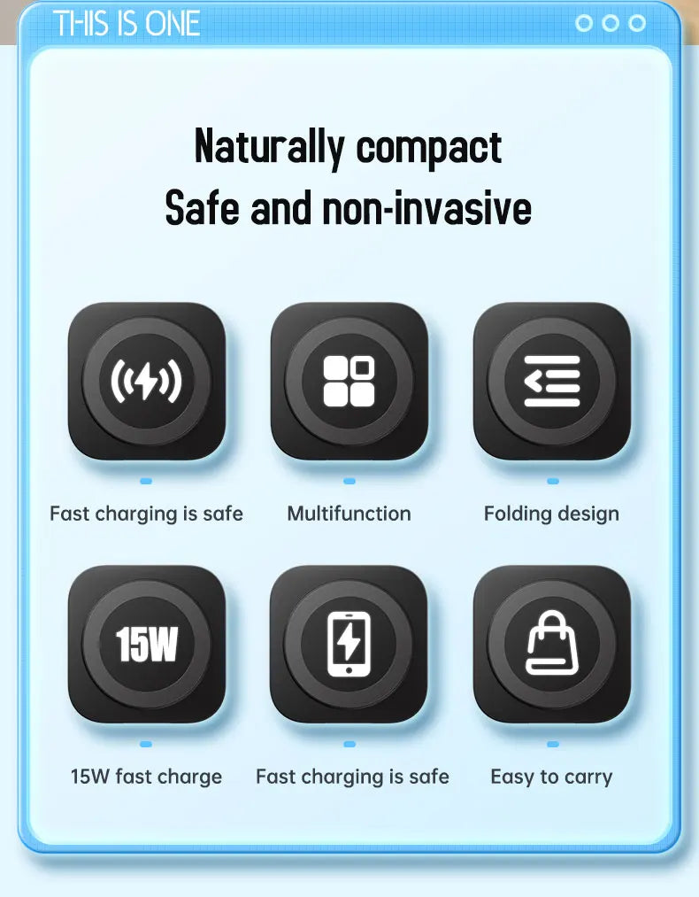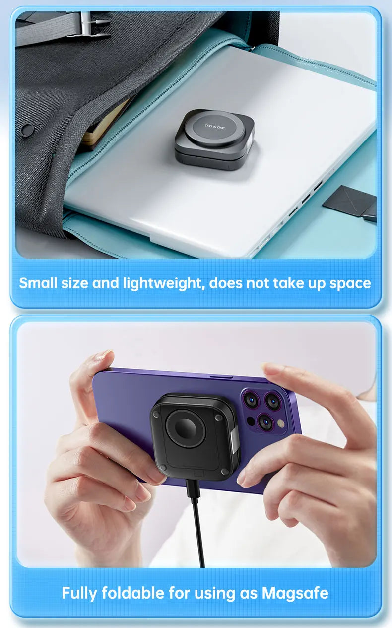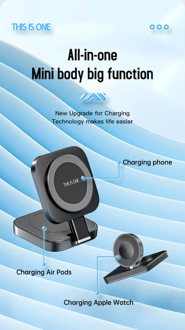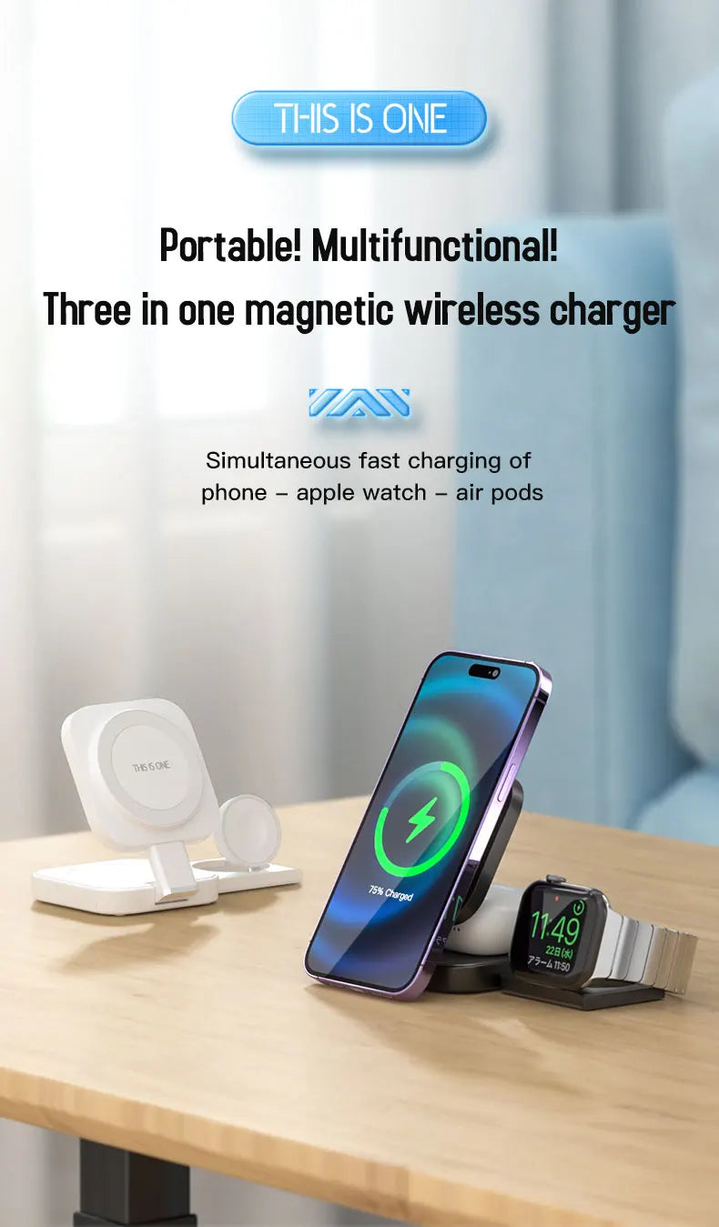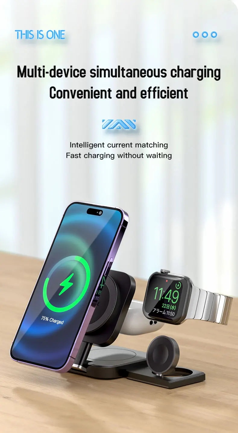 Upgrade your charging experience with this sleek, foldable 3-in-1 Magnetic Wireless Charging Stand, designed for iPhone 15/14/13/12 (MagSafe Compatible), Apple Watch, and AirPods 2/3!